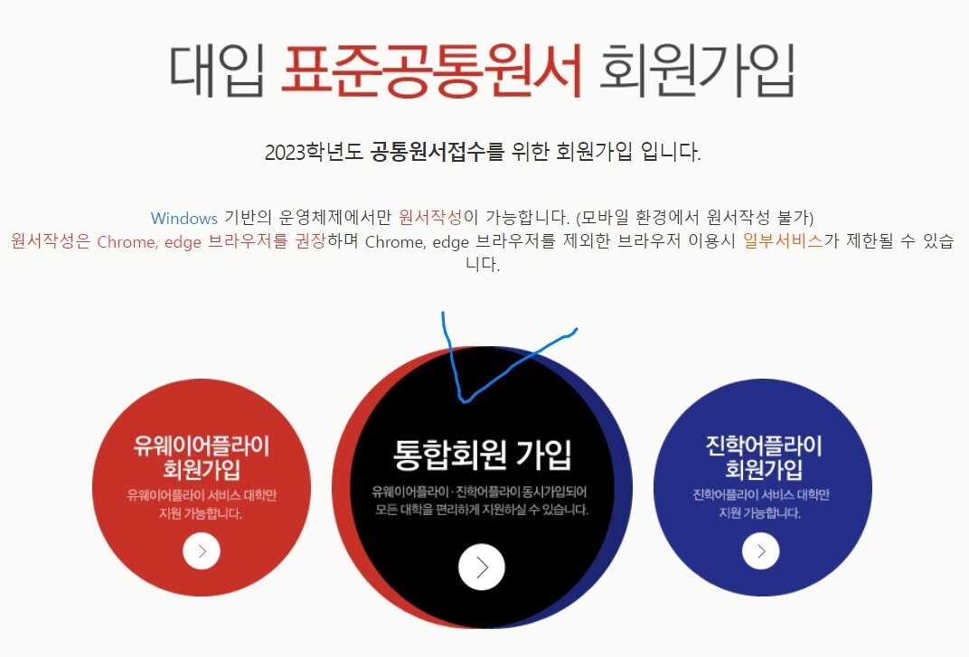 좌 유웨이어플라이 우 진학사어플라이 회원가입입니다. 조용히 무시해주시고 가운데 '통합회원 가입'을 클릭합니다.