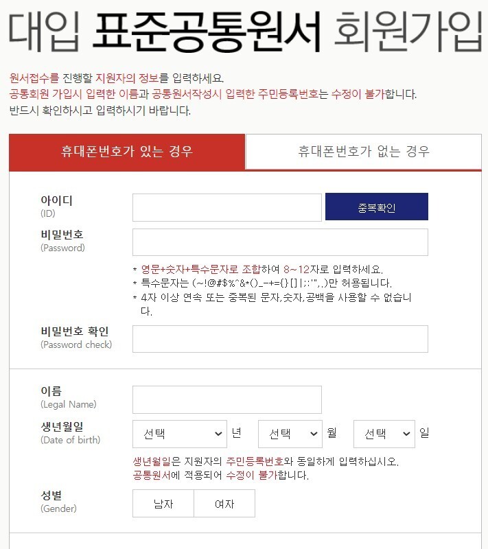주의할 점은 '회원가입은 반드시 학생의 정보로 해야합니다.' 부모님의 정보로 하면 부모님이 대학지원하는 겁니다.