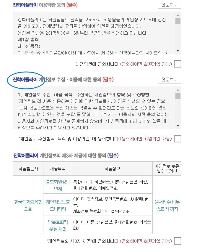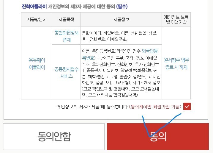 아래로 스크롤을 내리면 진학사어플라이도 동의하라고 나옵니다.