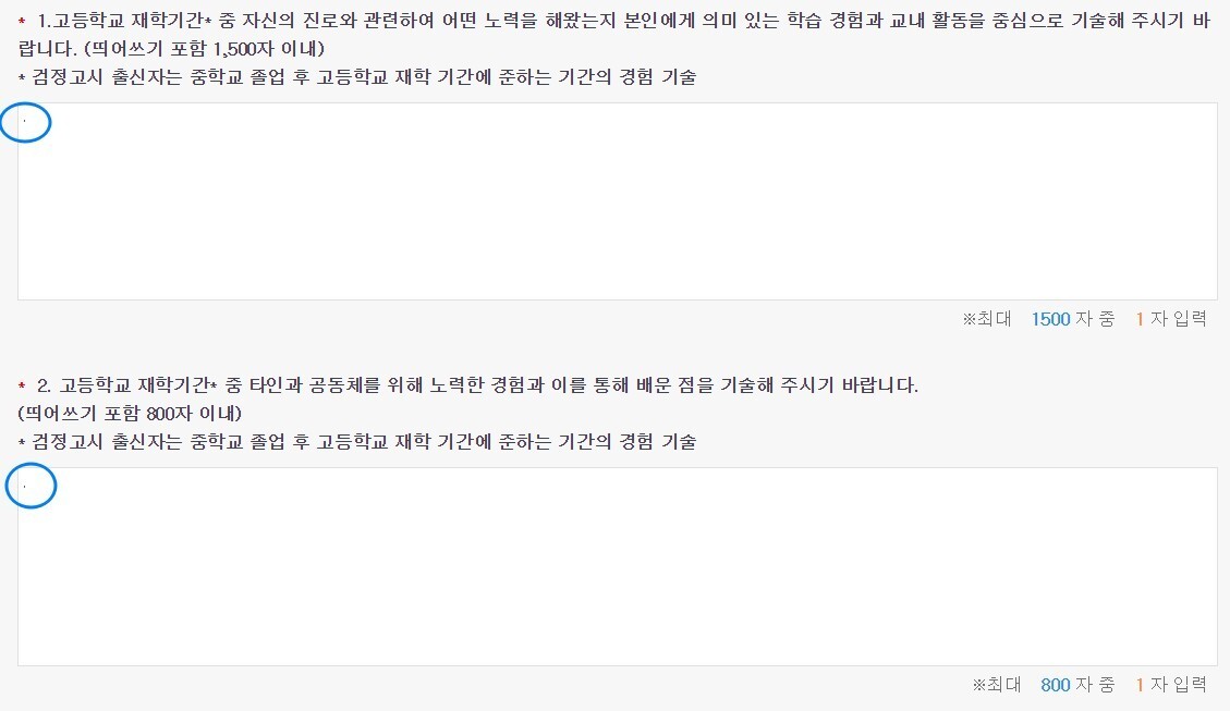동그라미 친 곳 보이시나요? 제가 점(.)을 하나씩 찍어뒀습니다. 점을 하나씩 찍어두면 나중에 원서접수할 때 자소서를 입력하지 않아도 원서접수가 됩니다.