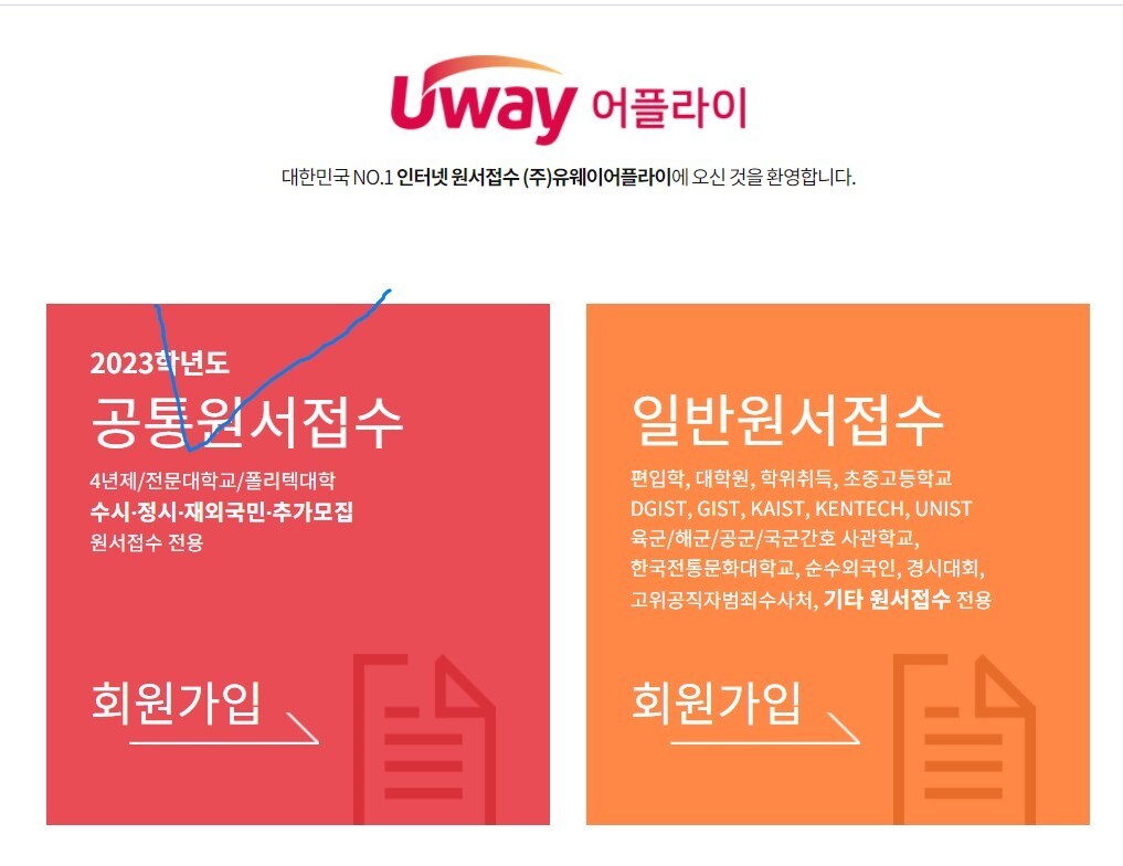 원서를 작성하기 위한 회원가입을 할 때는 반드시 '유웨이어플라이', 또는 '진학사어플라이'로 들어가야 합니다. 그냥 '유웨이'나 '진학사' 사이트로 들어가시면 안됩니다.