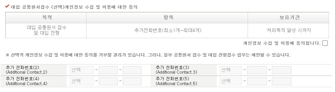 개인정보 수집에 동의하시고, 추가전화번호는 가족 번호, 담임샘 번호, 학원샘 번호 등을 입력하세요. 다 채우지 않으셔도 됩니다. 전화번호 입력된 순서로 나중에 추가합격 연락이 옵니다.