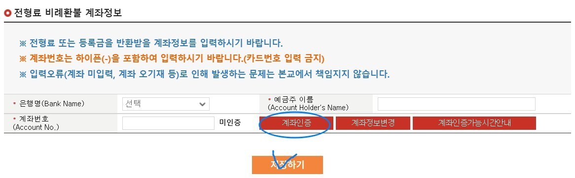 계좌번호 입력하시고 '계좌인증' 꼭 해주세요. 그리고 저장하기 하세요.