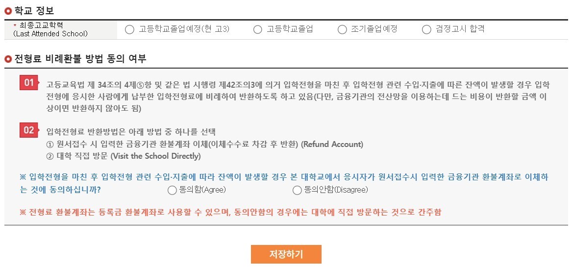 고교학력 클릭하고 전형료 환불에 대한 동의를 하시면!