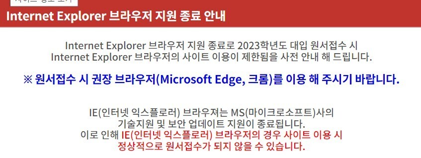저는 유웨이어플라이 사이트로 들어갔는데 들어갔더니 팝업으로 크롬이나 마이크로소프트 엣지를 사용해라는 안내문이 딱! 뜹니다.