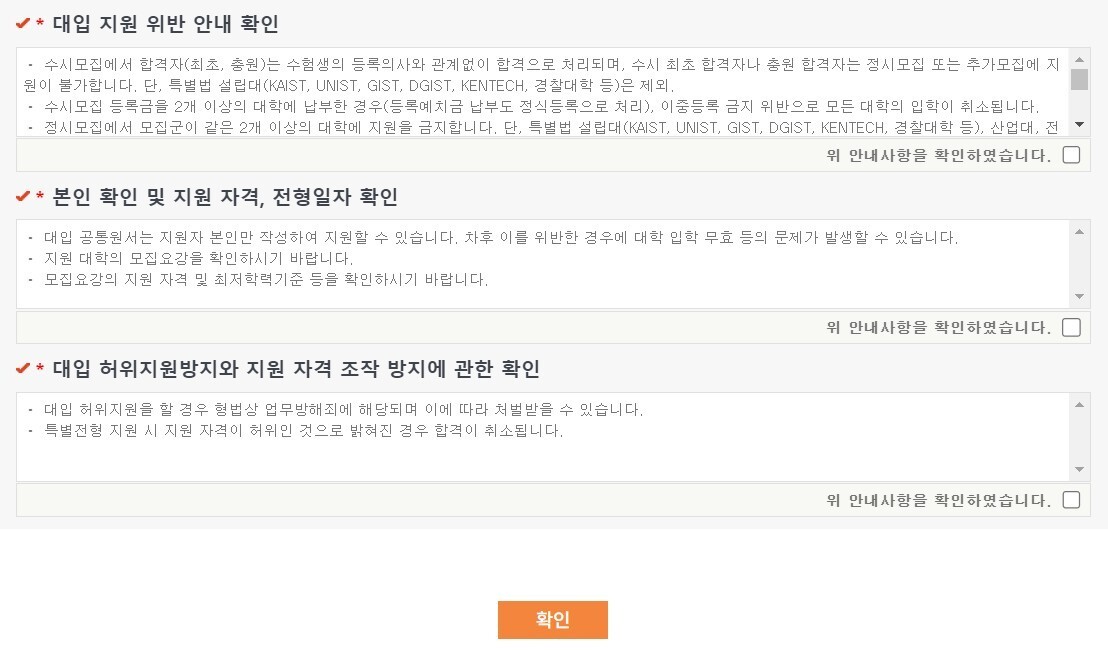 '*필수 입력 항목입니다.'라고 적혀있는데 사실 전부 필수입력항목이니까 그냥 전부 동의해주세요. 그리고 마지막에 '확인' 클릭!