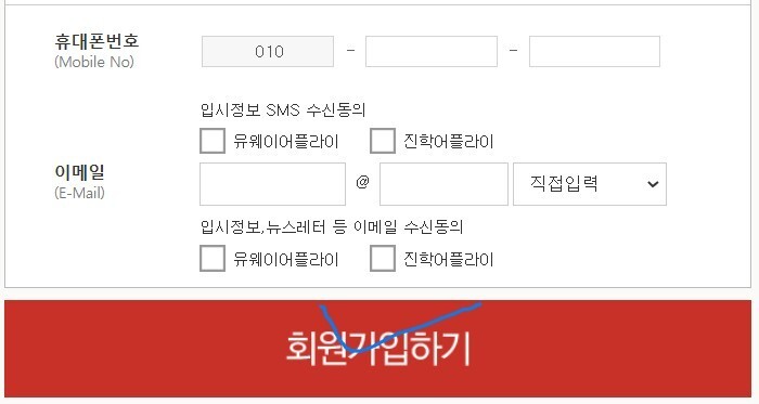 휴대폰번호와 이메일까지는 입력하고 '입시정보 SMS 수신동의' 와 '입시정보, 뉴스레터 등 이메일 수신동의'는 동의하셔도 되고 안해도 됩니다. 저는 안하고 넘어갔습니다. 그리고 '회원가입하기'를 클릭해주세요.