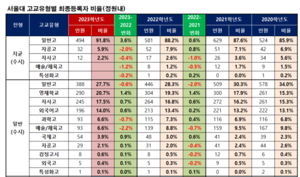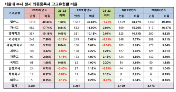 종로학원은 대학알리미에 공시된 2023학년도 대학 신입생 출신 고교 현황 분석 결과를 5일 내놨다.