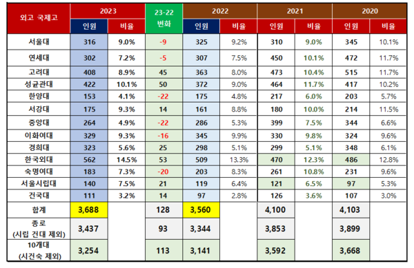 시립 건대 숙대를 제외하면 10개대 기준으로 외고 국제고생은 2022보다 113명 증가했다. 종로자료는 서강대도 제외되었는 데 아래 표는 서강대는 포함시켰다.