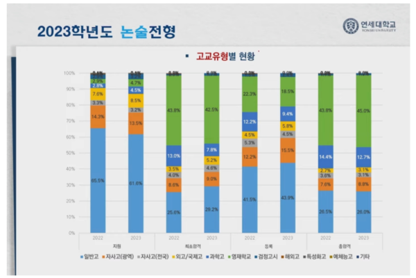 수능 전에 논술을 보고 최저기준이 없는 연세대 논술전형은 최종 합격자 기준으로 해도 일반고의 비율이 43.9% 밖에 안되고 영재학교 18.5%, 과학고 9.4%, 전국자사고 4.5%, 외고/국제고 5.8%, 광역자사고 15.5%가 등록하는 전형이다.