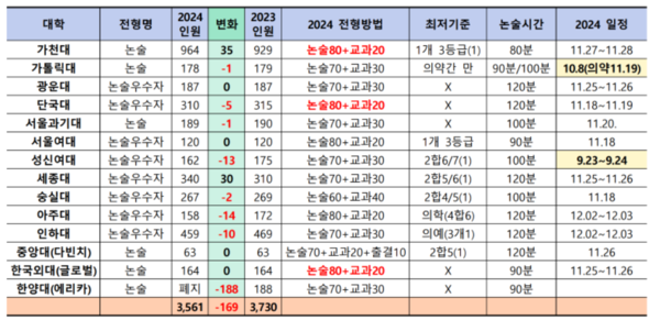 2024학년도에는 울산대와 한양대(에리카)가 논술전형을 폐지했고, 동덕여대, 삼육대, 한신대가 논술전형을 신설했다. 신설 대학 중에서 삼육대와 한신대는 80분 동안 국어와 수학 문제를 10문제 이상 풀어야 하는 약술형 논술 형식이다. 2021학년도까지 실시되었던 적성고사를 보던 대학들 중에서 가천대, 수원대, 서경대가 논술전형을 부활해서 새로운 유형을 만든 것이다.