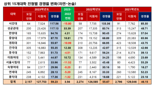 논술전형은 매우 높은 경쟁률을 기록하고 있다. 2021학년도 이후 모집인원이 감소하면서 지원자수가 늘어나지는 않고 있지만 인문계열, 자연계열 모두 경쟁률은 계속 상승하고 있다. 한양대 인문계열과 서강대, 성균관대 자연계열이 2023학년도에 100:1 이상의 높은 경쟁률을 기록했다.