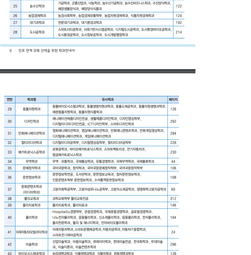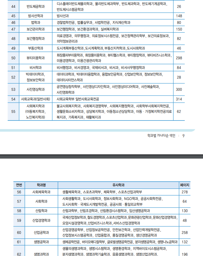 주요교과목, 개설대학, 졸업 후 진출분야, 권장과목, 권장역량, 권장도서 등