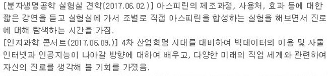 하지만 이런 류의 기록은 올림픽 정신은 잘 발휘되었어도 자기 주도성이나 활동의 깊이는 느낄 수 없는, 그저 평범한 수준의 기록에 머무르고 있습니다. (올림픽 정신 : 참가하는데 의의를 느끼는 정신) 이게 평범한 수준의 기록인 이유는 여러 가지로 설명이 되겠지만, “그랬다는 증거가 있어야지”로도 충분히 설명이 됩니다. (사례의 연식이 오래 되었지만 지금도 이런 형태의 세특이 여전함)