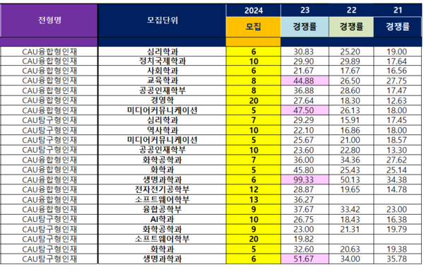 중앙대는 모집인원이 적습니다. 어떤 학과가 모집인원이 4명이라고 하죠
