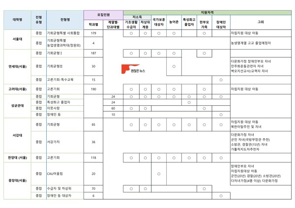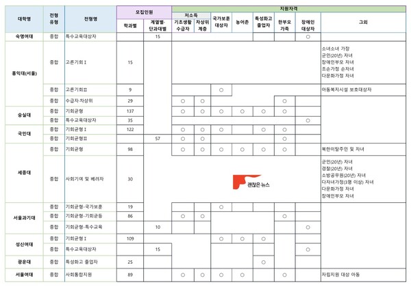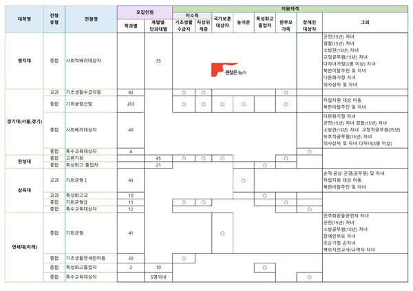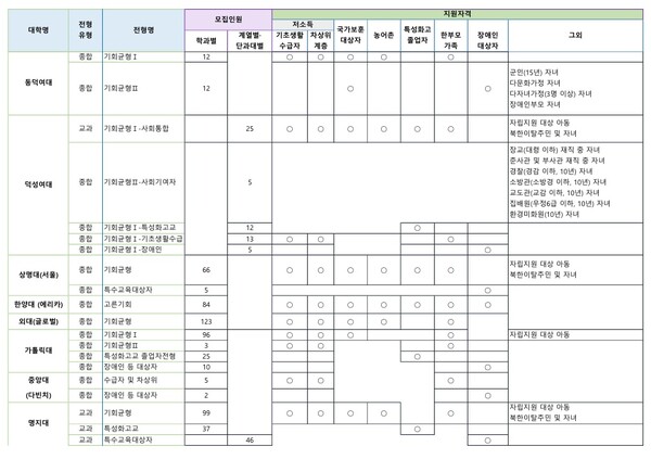 사회통합전형은 우선 지원자격을 따져보아야 합니다. 이 때 해당 대학의 사회통합전형이 여러 지원자격을 동시에 허용한다면 합격선이 올라갑니다. 기초생활수급자, 차상위계층, 한부모가정, 장애인, 국가보훈자, 보호종료 청소년 등 상대적으로 많은 지원자격을 허용하는 대학과 2~3개의 지원자격만 허용하는 대학은 합격가능성 측면에서 차이가 당연히 있습니다.