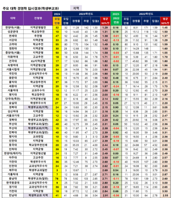 주요 대학들의 경영학 모집단위 입시결과를 비교해 보았다. 경영학과는 모든 대학에서 모집을 하고 있고, 선발하는 인원도 많아서 학생부교과전형, 학생부종합전형, 논술전형에서 골고루 모집을 하고 지역인재전형도 선발을 한다.