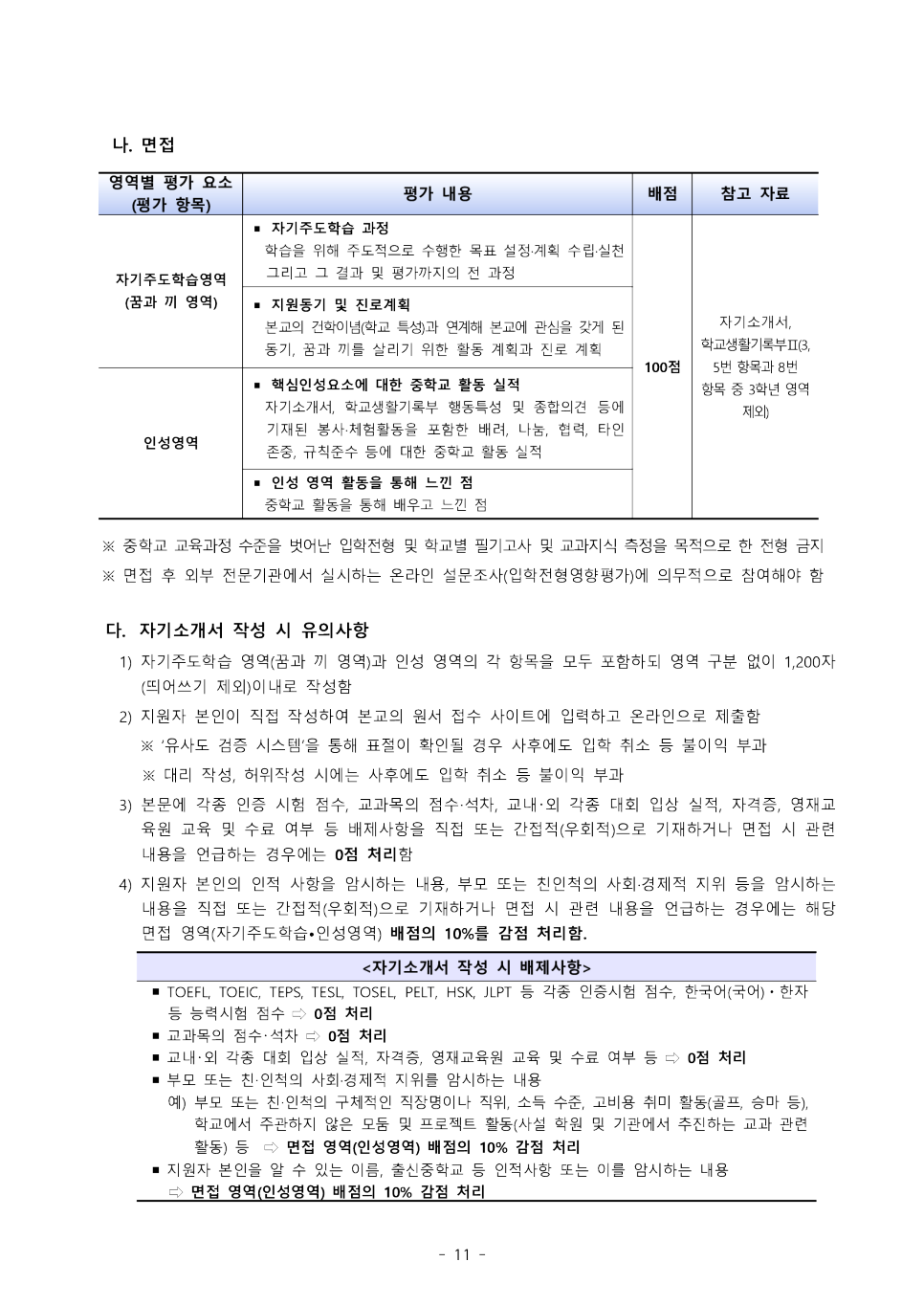 면접전형의 평가요소는 아래와 같습니다.