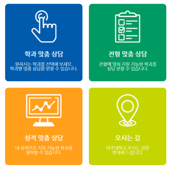 아주대 입학처 홈페이지에는 "최근 3개년 입시결과"라는 배너가 있습니다. 배너를 누르고 들어가면 아래와 같은 내용이 보여지는 데 수시 상담하기를 누르면 아래와 같이 학과 맞춤 상담, 전형 맞춤 상담, 성적 맞춤 상담 등의 메뉴가 나옵니다.