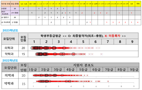 다만 의대와 약대 내신 산포도만 거의 비슷하게 정리를 해서 비교했습니다.