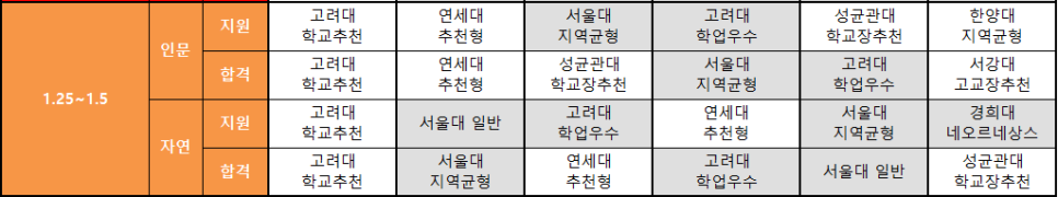 -1.0~1.5구간에서는 고려대(학교추천), 연세대(추천형), 성균관대(학교장추천), 서강대(고교장추천), 한양대 (지역균형),
