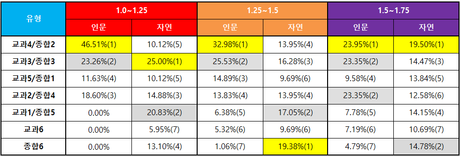 자연계열은 위에서 보듯이 학종 지원경향이 강했죠. 인문은 각 구간마다 대표적인 한 패턴에 집중하는 비율이 뚜렷한 반면에, 자연게열은 모든 구간에서 다 분산되는 모습을 보였습니다. 1.0~1.25에서는 교과3/ 종합 3으로 각각 반반. 하지만 1.25~1.5 구간에서는 학종에 6장 모두 지원하고.. 같이 말이죠. 하지만 확실한건 자연계열은 수시에서는 교과가 아니라 학종에 치우치고 있다는 것입니다. 이렇게 자연계열 최상위 구간에서는 교과성적이 하락할수록 교과전형을 줄이고 학종에 쏠리는 경향을 보이고 있습니다.