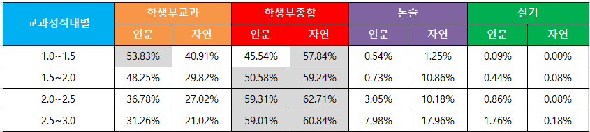 교과성적 1.5이내의 최상위권 인문계열 학생들은 학생부교과전형을 지원한 비율(53.83%)이 가장 높았고, 자연계열 학생들은 학생부