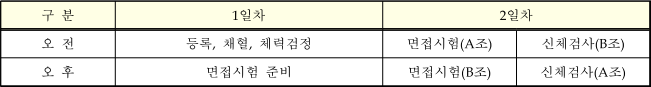 2일차 오전에는 면접시험(A조) / 신체검사(B조) 오후에는 면접시험(B조) / 신체검사(A조) 진행합니다.