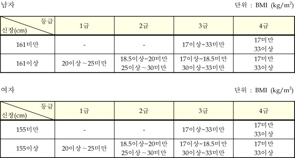 가. 신체 등위(신장/체중)와 장교 선발 및 입영 기준 신체검사로 구분