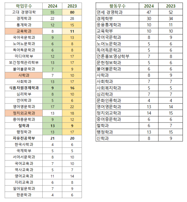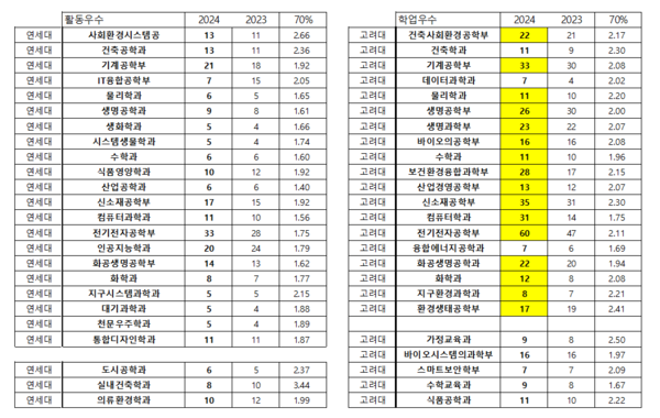 자연계열의 24-23 학종 차이입니다. 교과전형은 올해 고대 모집인원 변동이 크고 첨단학부 신설이 있어서 연고대 인원 비교가 적절한 것 같지는 않습니다.