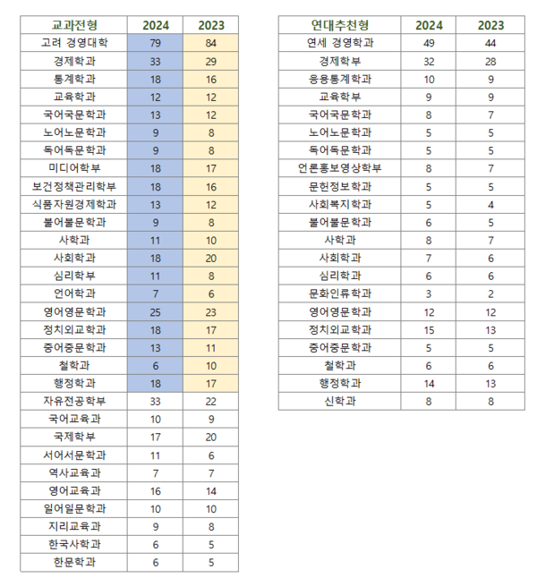 23-24 연고대의 모집인원 비교입니다. 일부과들은 연대가 고대의 60% 수준입니다.