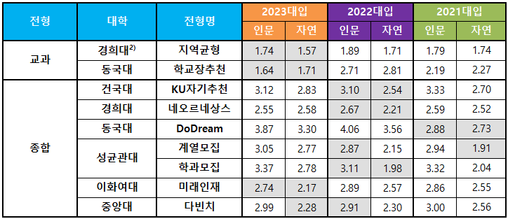 음영은 2021~2023대입의 동일 전형 중 합격자 평균 교과성적이 제일 높은 경우