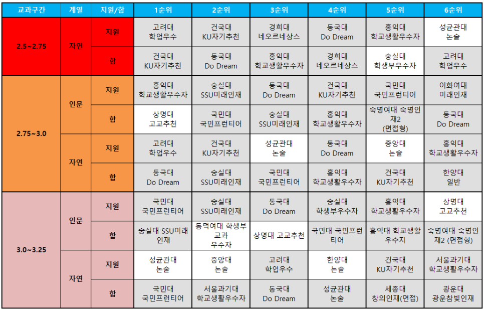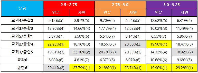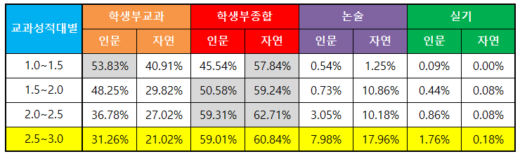 2.5~3.25구간에서는 교과전형보다는 학생부종합전형으로 상향 지원