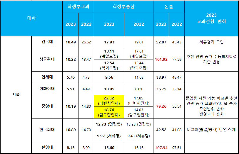23-22학년도 주요대학 경쟁률 비교