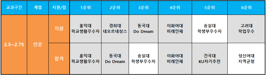 ❙ 교과성적 2.5~2.75구간 수시 지원 및 합격자 상위 6개 대학(전형)