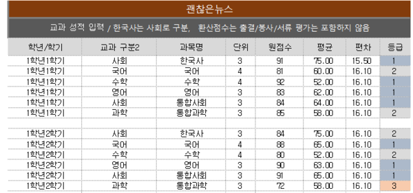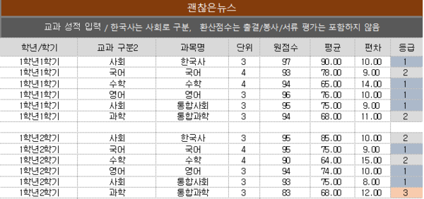 가상의 사례를 만들다보니 한국사를 산입했습니다. 28 교육과정은 한국사도 절대평가입니다.