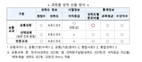 2015개정교육과정과 비교하면 표준편차가 사라지고 성취도별 분포비율이 제공되는 점이 숨겨진 차이점입니다. 표준편차가 제공되지 않으면 현재 연세대가 반영하는 Z점수를 계산할 수 없기 때문에 학생의 상대적인 위치를 정확하게 파악하기 어렵습니다.