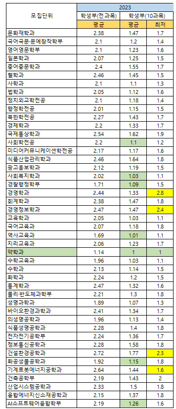 세무학과 나 화공과가 1.3등급대가 나올 수도 있다는 이야기입니다.