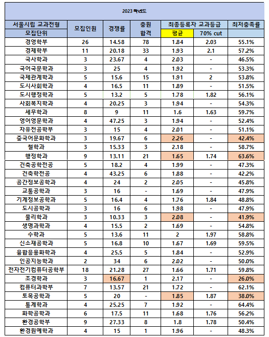 컴퓨터나 행정은 3개 7이라는 현행 최저가 충족률이 60%이니 더 올려도 되겠지만 토목이나 조경을 생각하면 학과를 그룹핑을 해서 최저를 달리하는 방식을 써야 할 것으로 보입니다. 합격자 평균이 0.2~0.3정도 좋아질 것으로 보입니다.