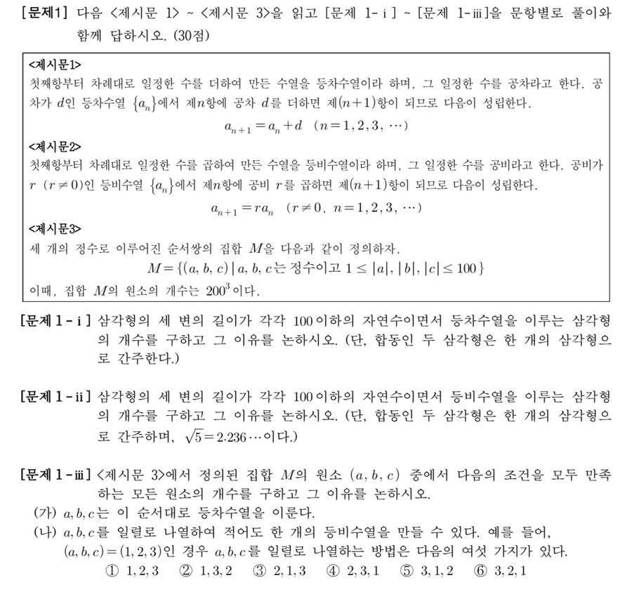 문제1은 등차수열 등비수열 개념을 삼각형의 세 변이라는 데이터에 적용해 문제해결능력을 평가하고자 했습니다.