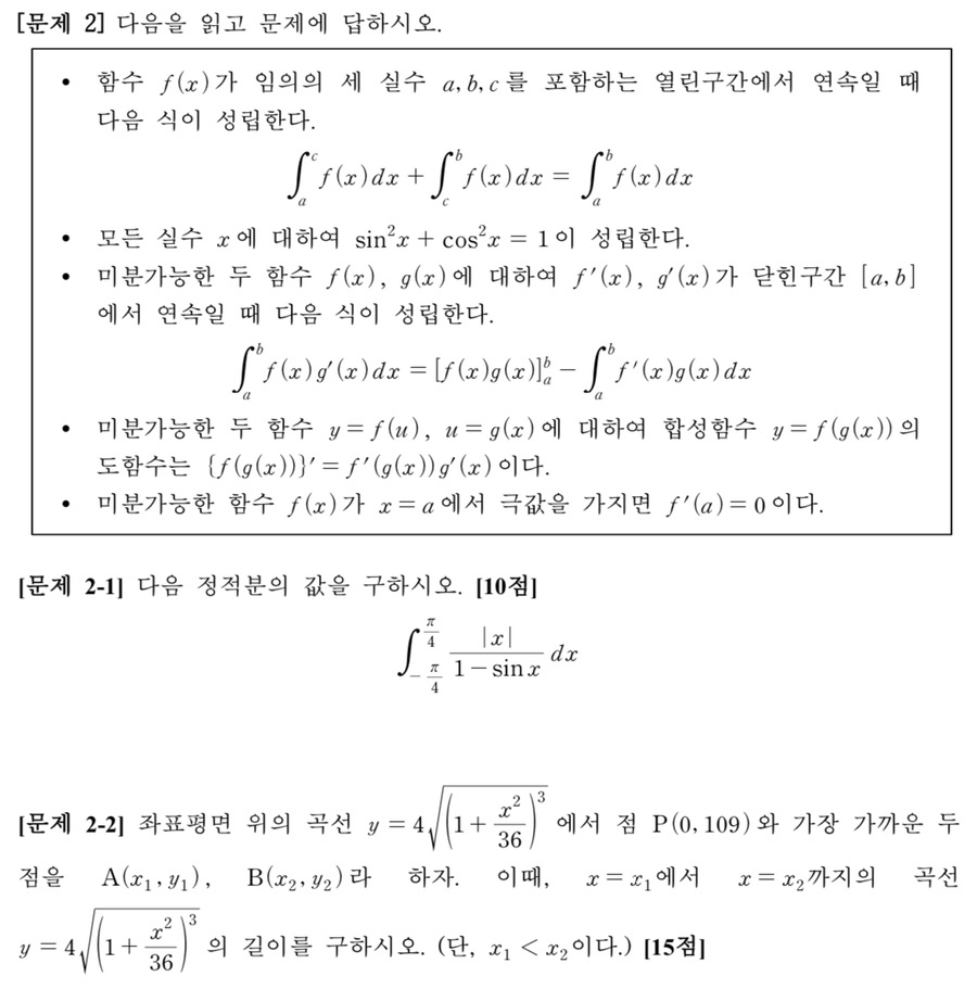 문제2와 3은 각 2개의 소문항으로 구성됩니다. 소문항2-1은 정적분을 계산할 때 정적분의 구간을 나누어 계산을 할 수 있는지를 평가합니다. 삼각함수의 성질을 이용해 식을 정리하고 부분적분을 이용해 정적분을 계산하는 과정을 이해하고 있는지도 확인했습니다. 2-2의 경우 두 점 사이의 거리에 대한 함수를 찾고 미분을 이용해 최솟값을 찾는 과정을 이해하고 있는지를 평가했습니다. 정적분을 이용해 곡선의 길이를 구할 수 있는지, 이때 정적분에 대한 계산을 수행할 수 있는지도 평가했습니다.