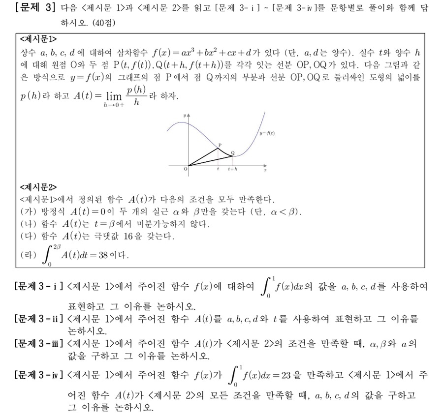 문제3은 정적분과 넓이와의 관계를 이해하고 도함수의 정의 및 함수의 극대 극소를 이용해 주어진 문제를 해결할 수 있는지를 평가하고자 했습니다.
