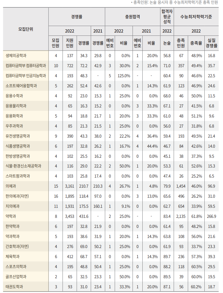 2022학년도 고려대 약학과 학생부 등급 평균은 2.16등급이었습니다. 최초합격자와 최초등록자의 점수 차이가 없을 정도로 최초합격한 학생들이 모두 등록해 충원은 없었습니다. 경쟁률은 2022학년도 408.9대1이었고, 작년의 경우 일반 522.8대1, 지역인재 62대1의 경쟁률을 보였습니다. 고려대 약학과 논술전형은 3합 5의 높은 수능 최저에 다른 약대와 달리 과탐 2과목 평균을 반영하므로 무엇보다 수능에 대한 철저한 준비가 필요합니다.