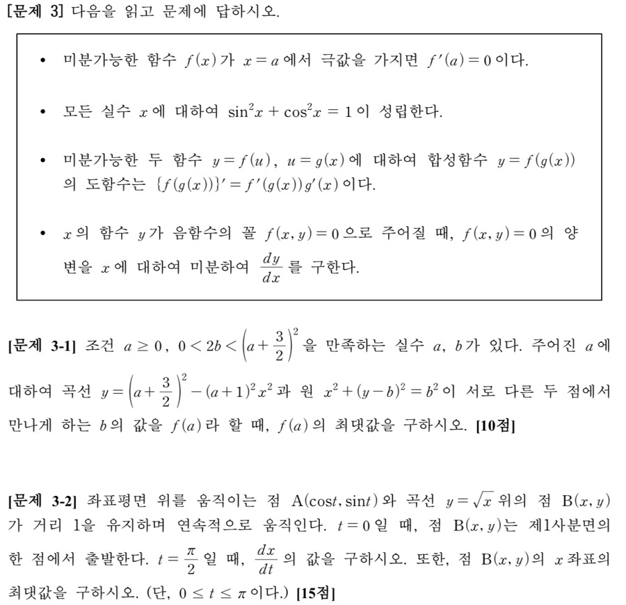 소문항3-1은 곡선의 그래프를 이해하여 함수를 구할 수 있는지, 미분을 이용하여 구한 함수의 최댓값을 구할 수 있는지 평가했습니다. 3-2의 경우 음함수 미분법을 이용해 주어진 미분값을 구할 수 있는지, 극댓값의 성질을 이용하여 최댓값을 구할 수 있는지 평가했습니다.