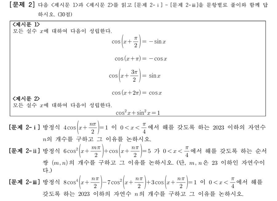 문제2는 삼각함수의 성질을 잘 활용해 삼각함수로 주어진 식을 다항식으로 변형하고 이를 통해 문제를 해결할 수 있는지를 평가합니다. 또한 정의역이 범위가 주어졌을 때 삼각함수가 취할 수 있는 값의 범위를 알아낼 수 있는지를 평가하고 다항식으로 주어진 함수의 그래프를 그려 방정식의 해가 주어진 구간 안에 존재하는지를 평가했습니다.