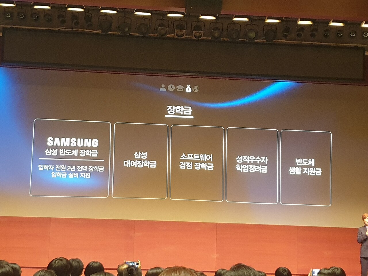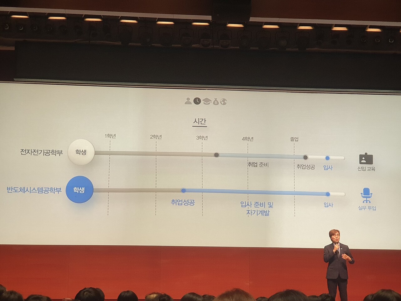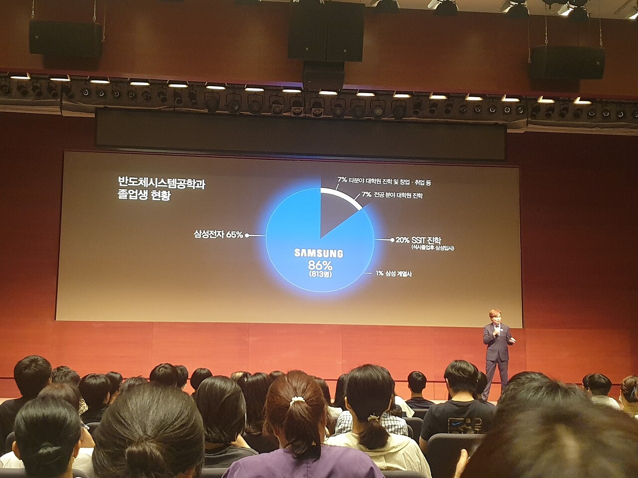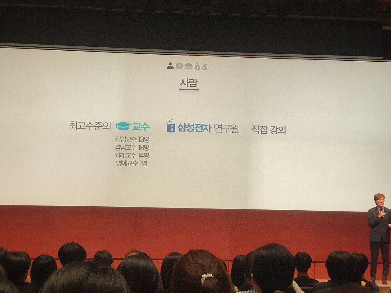 다들 아시겠지만 삼성과 2007년부터 계약되어 진행한 반도체학과여서 역사도 오래되어 기반이 잘되어 있고 반도체건물자체가 따로 있으며 교수진도 많으시고 현재 800명의 선배들이 삼성 현장에서 근무하고 있어서 도움도 많이 받을수있는 장점이 있다며 자부심이 대단하셨어요